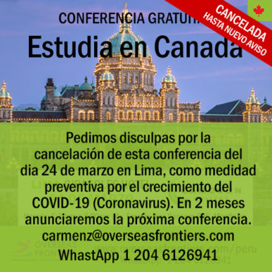 Pedimos disculpas por la cancelación de nuestra conferencia en Lima el dia 24 de marzo, sobre “Estudiar en Canadá” como medida preventiva por el crecimiento de COVID-19 (Coronavirus).