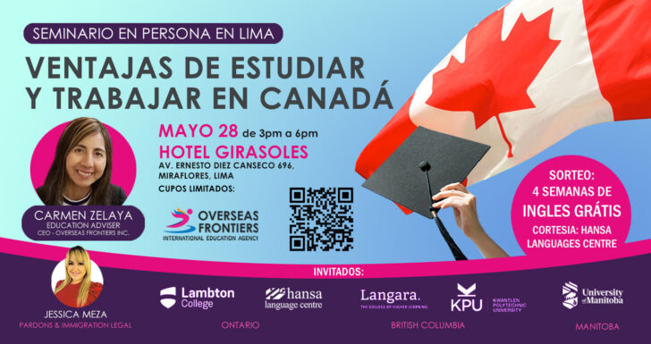 Overseas Frontiers tiene el agrado de invitarlo al seminario gratuito sobre las “Ventajas de estudiar y trabajar en Canadá” que se llevará a cabo de manera presencial el 28 de mayo de 3pm a 6pm en el Hotel Girasoles en Av. Ernesto Diez Canseco 696, Miraflores, Lima, Perú. Contaremos con la participación de algunas instituciones de renombre en Canada como Lambton College de Ontario, KPU e Langara de British Columbia y la Universidad de Manitoba, además tendremos a Jessica Meza (consultora de inmigración). Haremos un sorteo de 4 SEMANAS GRATIS DE INGLES online, cortesía de Hansa Language Centre.