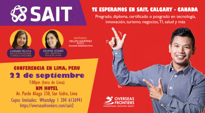 Overseas Frontiers lo invita a la conferencia en Lima, Perú el 22 de septiembre a las 7pm, en NM Hotel en Av. Pardo Aliaga 330, San Isidro, Lima. SAIT localizada en Calgary, Alberta, Canadá te ofrece programas de pregrado, diploma, certificado o posgrado en tecnología, innovación, turismo, negocios, TI, salud y más. Overseas Frontiers te hace la matricula con consulta gratuita. Cupos limitados, inscribete ahora
