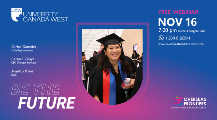 UCW & Overseas Frontiers te invitan para el zoom webinar a realizarse el dia 16 de noviembre a las 7:00pm (hora de Lima y Bogota). University Canada West ofrece becas para un MBA y licenciatura en Artes y Comunicación o Negocios. UCW ubicado en Vancouver tiene DLI # y con ellos ganas PGWP de hasta 3 años. Tendremos como invitada a Angelica Potes consultora de inmigración. ¡Overseas Frontiers te da consulta gratuita, te hace la matricula y acompañamos tu proceso hasta que llegues a Canadá!